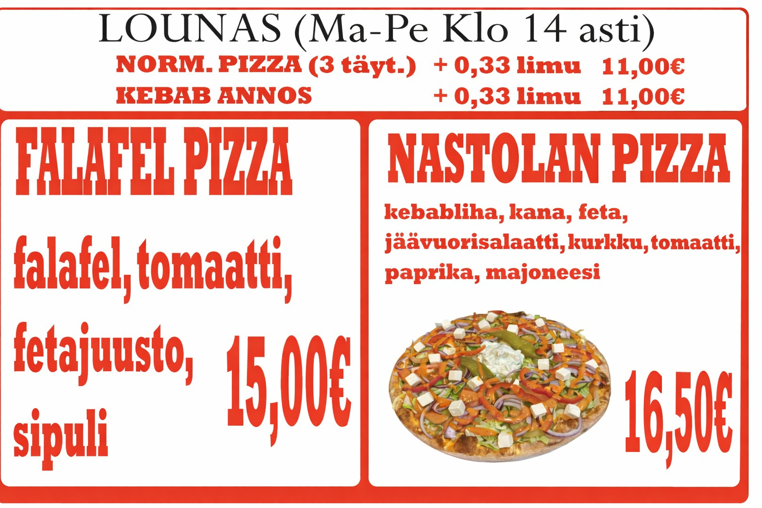 Ananas, aurajuusto, BBQ-kastike, salaattijuusto, kana, suolakurkku, herkkusieni, jalapeno, jauheliha, kananmuna, katkarapu, kebab, kinkkusuikale, salami, mozzarella, oliivi, paprika, pekoni, simpukka, pepperonimakkara, sipuli, tacokastike, tomaatti, tonnikala, tuplajuusto, smetana, vihreä pepperoni